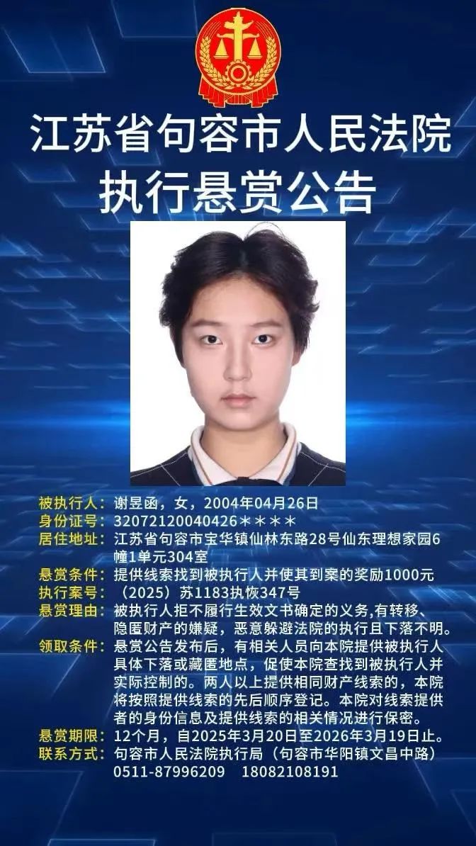 2004年出生的女生谢昱函,被江苏句容法院部门公开悬赏!